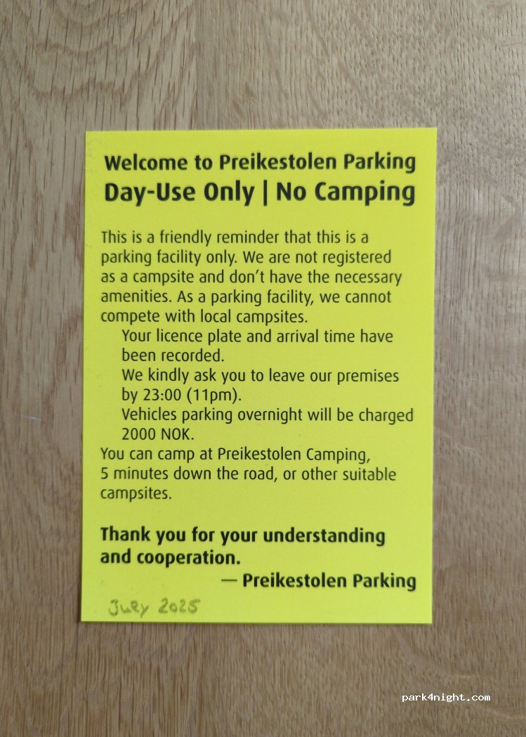 Wir wurden um 23.00 Uhr aufgefordert den Platz zu verlassen. Wir waren mit einem Kastenwagen da. Eigentlich wollten wir am 22.07.21 auf den Preikestolen, sind aber doch noch am Abend des 21.07.21 hochgegangen. Wer mit dem Camper kommt sollte eventuell so planen, dass man vor der Tour bzw. danach einen nahegelegenen Park4Night bzw. anderweitigen Platz zum Schlafen findet.