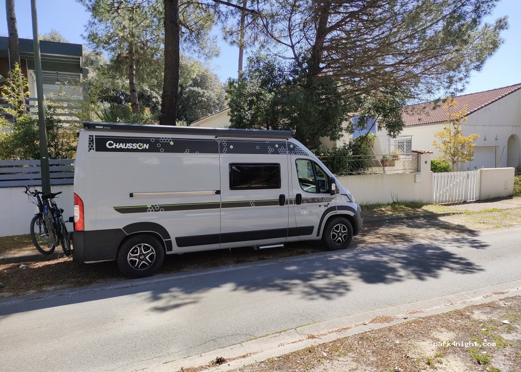 Parkplätze groß genug für ein Wohnmobil auf der Avenue des Amazones, kein Parkverbot wie auf dem Boulevard Frédéric Garnier. Anwohner natürlich nicht stören. Duschen am Strand und öffentliche Toiletten. In Strandnähe, 5min zu Fuß.