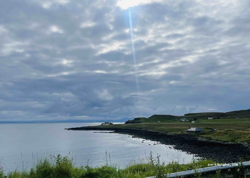 Great spot over looking a small bay, facing north. sheltered from east, south and west wind somewhat, Internet speed test of over 100mb with three 5G. Enough for 3 or 4 spots. Very sharp turn off main road if coming from Kilt Rock direction.