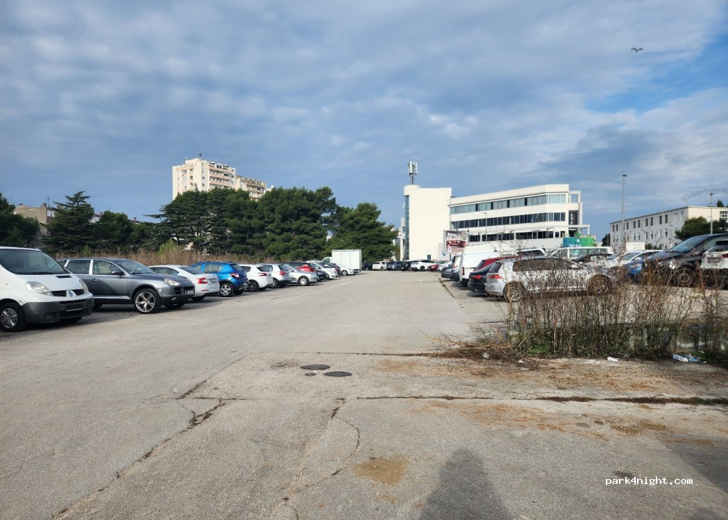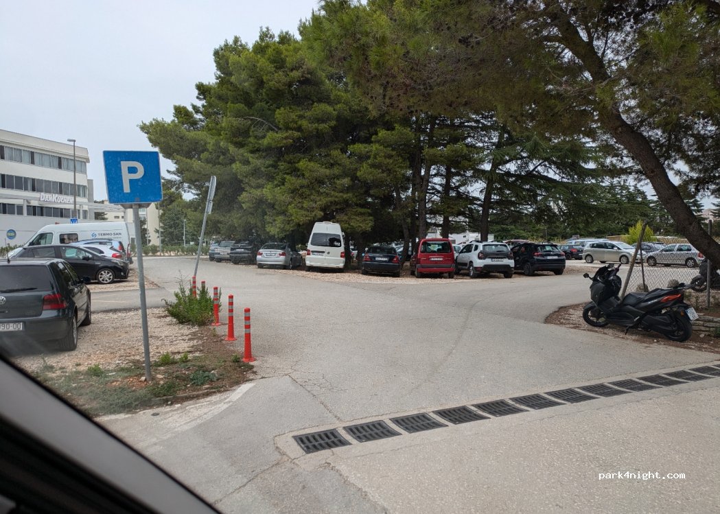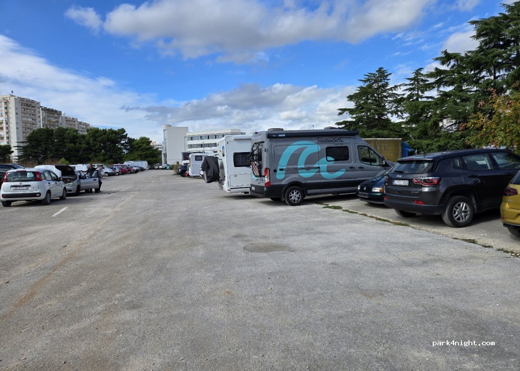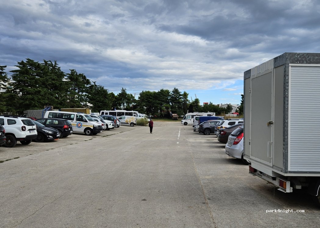 Perfect voor een stedentrip Zadar. Drie nachten verbleven en geen problemen. Iedere nacht stonden er meerdere campers en busjes. Centrum gemakkelijk te voet te bereiken en naast winkels. Rond 6.00 uur begint er wat te rijden maar lawaai valt mee. Geen diensten, alleen containers net buiten de parking.