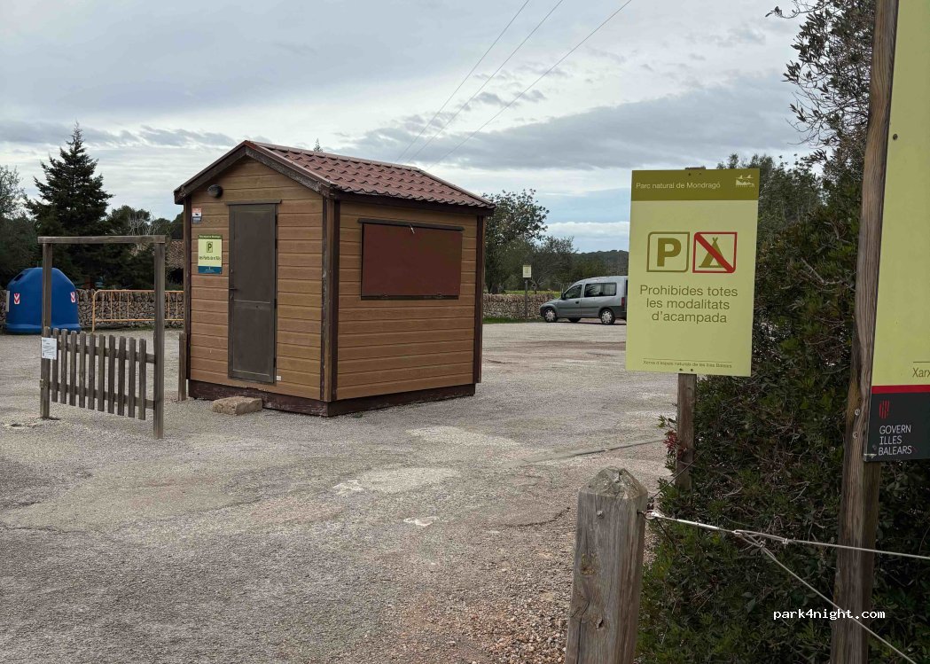 Parking gratuito si llegas a la noche. Debido al covid no pagamos los 5 euros. Con baños y y papeleras. Dentro de un hermoso parque natural, a 5 min andando de la cala de mondrago y a 10 de s’amarador.