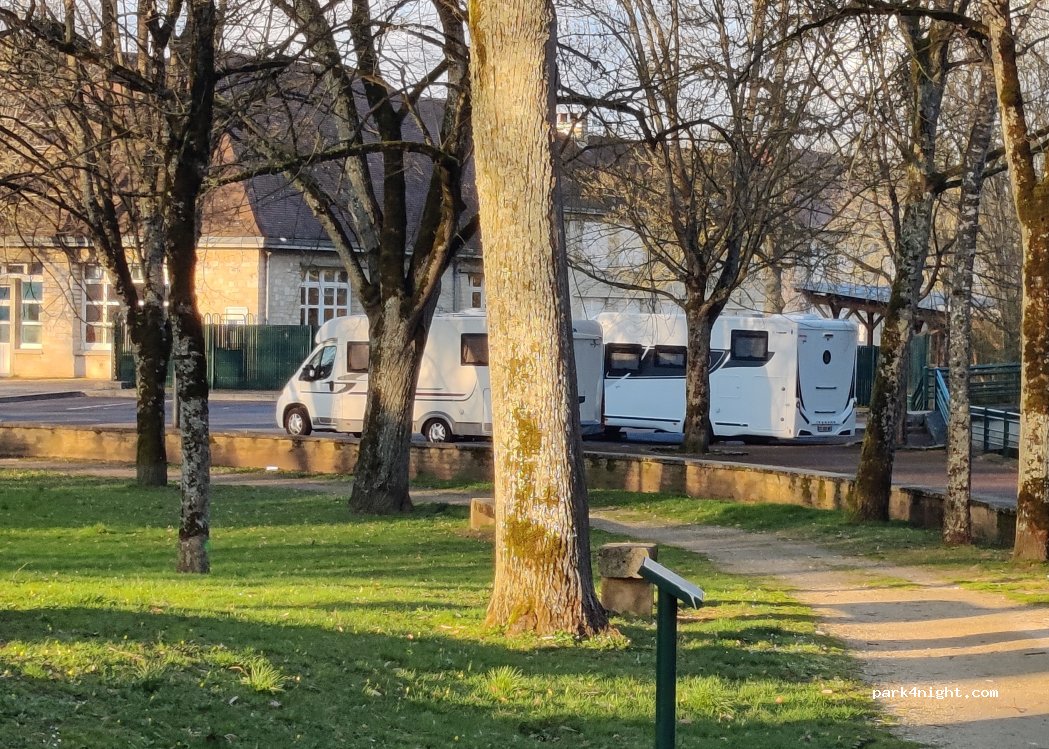 Au top, parking gratuit proche du centre ville collé à un parc. Éclairage public donc rassurant pour y passer la nuit. 5 min à pied du marché (samedi matin) Réseau 4g et tnt ok
