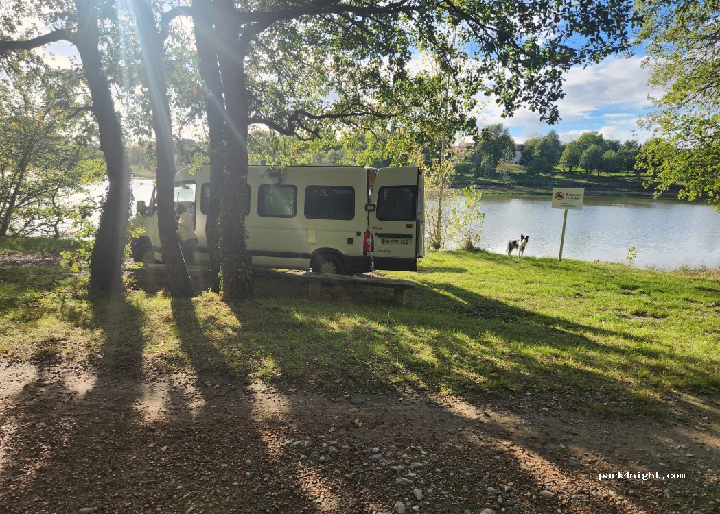 At the edge of the small lake of Combe Cave with near the leisure park of Saint Sardos, very quiet night. Some fishermen who left at dusk. There are two concrete benches . The path is rather small for a big vehicle such as the camper access complicated because of the low branches.