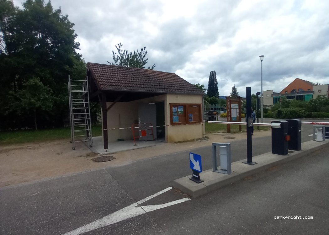 Aire calme à 8 € la nuit avec toilettes et douche, électricité avec jetons à la borne d'entrée. Service à l'extérieur vidanges et eaux. Gare à proximité pour Colmar, Strasbourg. Le bruit des trains n'est pas gênants et pas de trains la nuit.