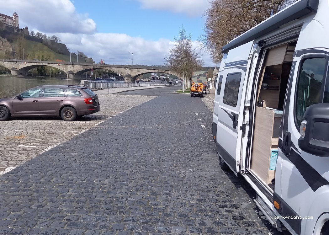 Es ist ein Parkplatz. Das muss man wissen. 19 bis 9 Uhr kostenlos. Top gepflegt, bitte rumfahren und nach geraden Plätzen gucken. Innenstadt in 10 min (z.B.Backöfele Restaurant). Main und Festung direkt schön vor der Nase. 15 min morgens zum Wochenmarkt, super, der hintere Teil ist ruhiger& schmaler%flacher. schiffe tuckern vor der Nase vorbei, Blick auf Festung