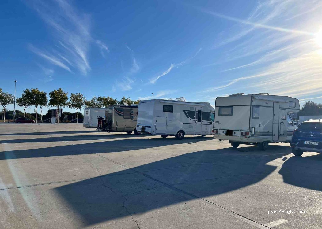 Gran parking asfaltado, no hay señales de prohibición. A 20 minutos andando del centro. Supermercados y cafeterías cerca, enfrente hay una estación de servicio con punto de llenado y vaciado por 5€. Los viernes no se puede aparcar hasta las 18:00 por mercadillo. Viendo cómo está el tema por esta zona, nos interesa cuidar este sitio, seamos discretos y evitemos comportamientos de acampada.