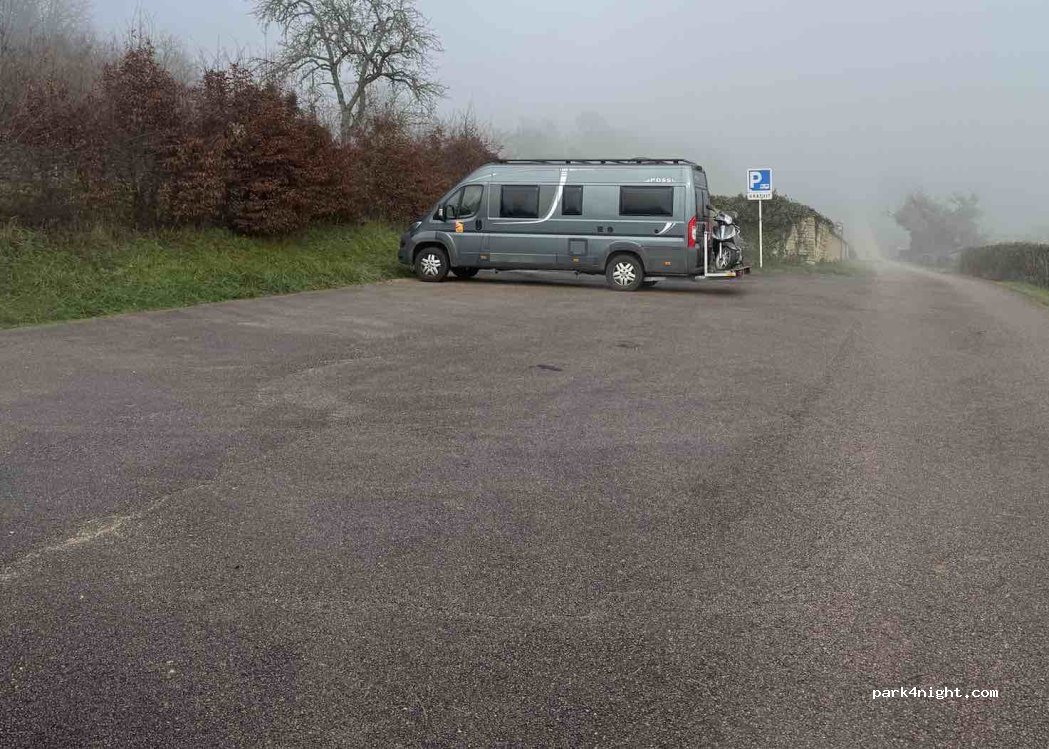 Parking très proche du village. Prévoir cales. Belle vue sur la campagne. Les parking sur le haut du village sont désormais interdit aux camping car.