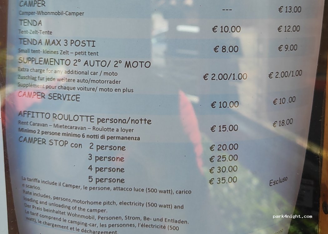 Siamo stati qui il weekend e siamo stati benissimo.20€ fino alle 12:00 del giorno dopo in bassa stagione.Non eravamo tanti camper e quindi avevamo abbastanza spazio a disposizione.Il camping si presentava pulito e silenzioso.Staff gentilissimo e disponibilissimo. Presenza di piccolo parco giochi per bimbi e di un ristorante molto frequentato.Opi a poche centinaia di mt.Sicuramente ci torneremo.