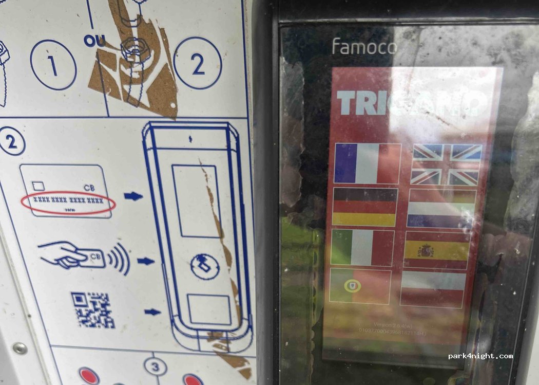 Possibilité de remplir l’eau et vider les eaux noires mais pas les eaux grises (grille bouchée). À proximité sur le parking, un kiosque pour remplir des bouteilles d’eau naturelle ou pétillante (0,5€ le litre)