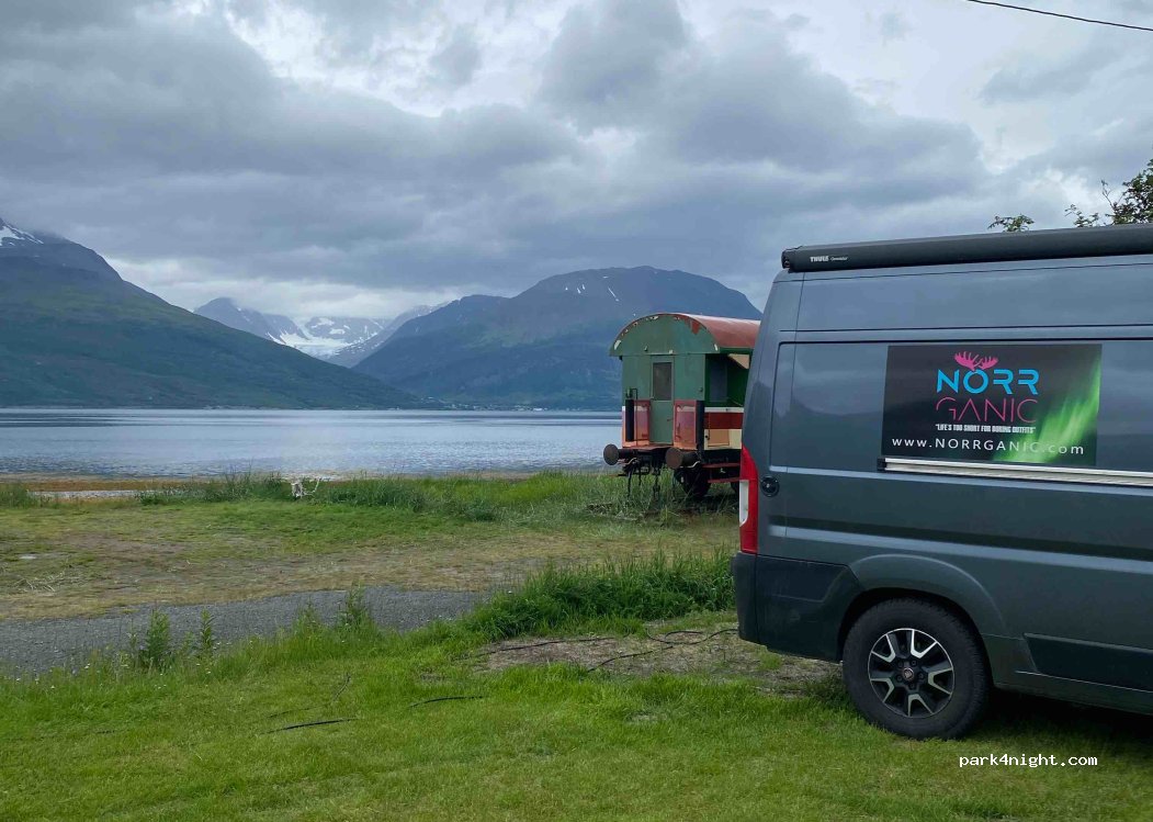 Petit camping avec caravanes stationnées à l’année. Quelques emplacements pour camping-cars au bord du fjord. Placement libre. Facilités en très bon état : grande cuisine, toilettes, vidange eaux grises et noires, douche payante (20 KRN pour 5 mn), lave-linge, (pas de sèche linge), WiFi, électricité, eau. Contact très aimable au téléphone. Une dame qui ne parle pas anglais est passée encaisser le règlement par CB avec son fils au téléphone qui assurait la traduction. Possibilité de déposer l’argent directement dans la boîte aux clés. Acceptent les euros. Vue exceptionnelle sur les Alpes norvégiennes.