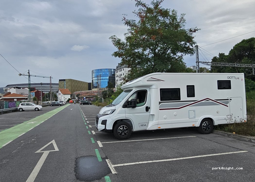 Buen sitio de aparcamiento tanto para visitar la ciudad como para pernoctar. Por 1€ estuvimos 24 horas con la noche incluida. Cerca del Estadio San Mamés y cerca de la estación de tranvía que lleva al centro. La única pega es que esta pegada a las vías del tren y es algo ruidoso.