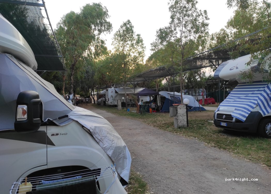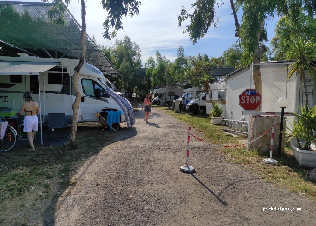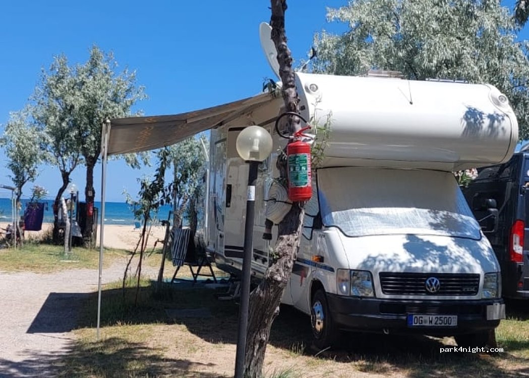 Der Platz heißt "EdenBlu". Stellplätze an beiden Straßenseiten, an der Strandseite seehr eng. WC-Kassette darf man nur zu festgelegten Zeiten entleeren. Vorteil: Direkt am breiten Sandstrand mit Dusche. Nachts ruhig. Ruhe hängt stark vom Nachbarn ab. Teuer! 36€ für Womo/2Pers. in HS. Es werden nicht nur Wohnmobile aufgenommen.
