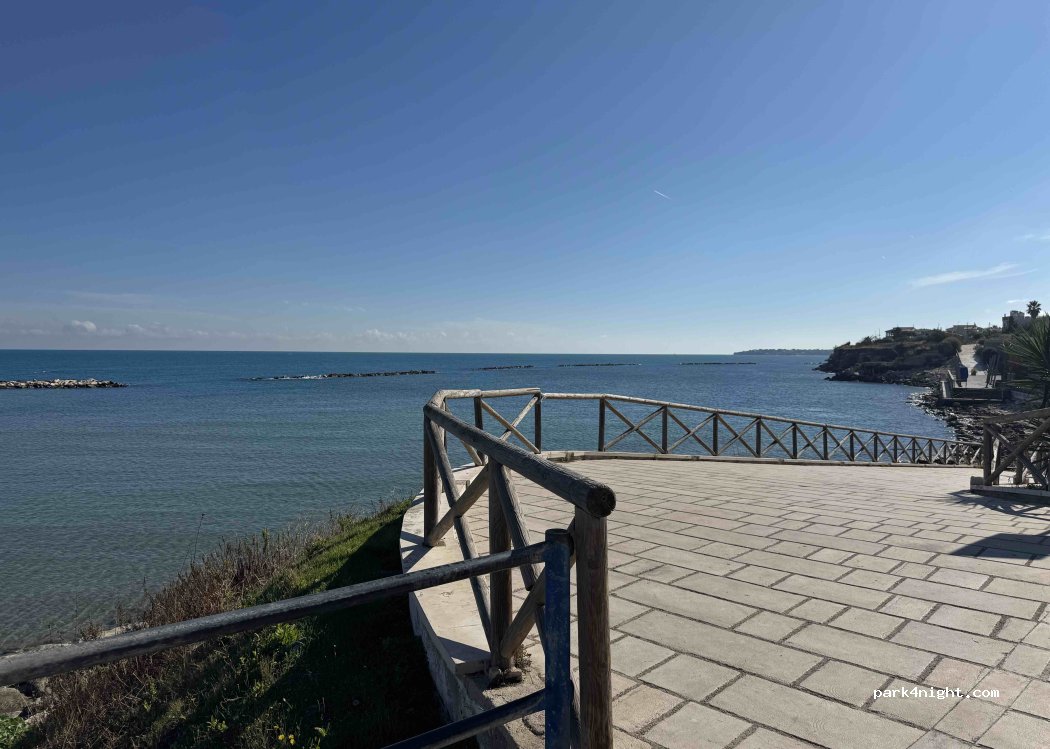 Nice place next to the sea. Free parking and no restrictions at night. Wouldn’t recommend for large motor homes. Restaurant ‘Trani Go Go’ behind is lovely and cheap. Nice small town near Trani (was too busy to park so we carried on to here). Passage of some cars at night and joggers in the morning.