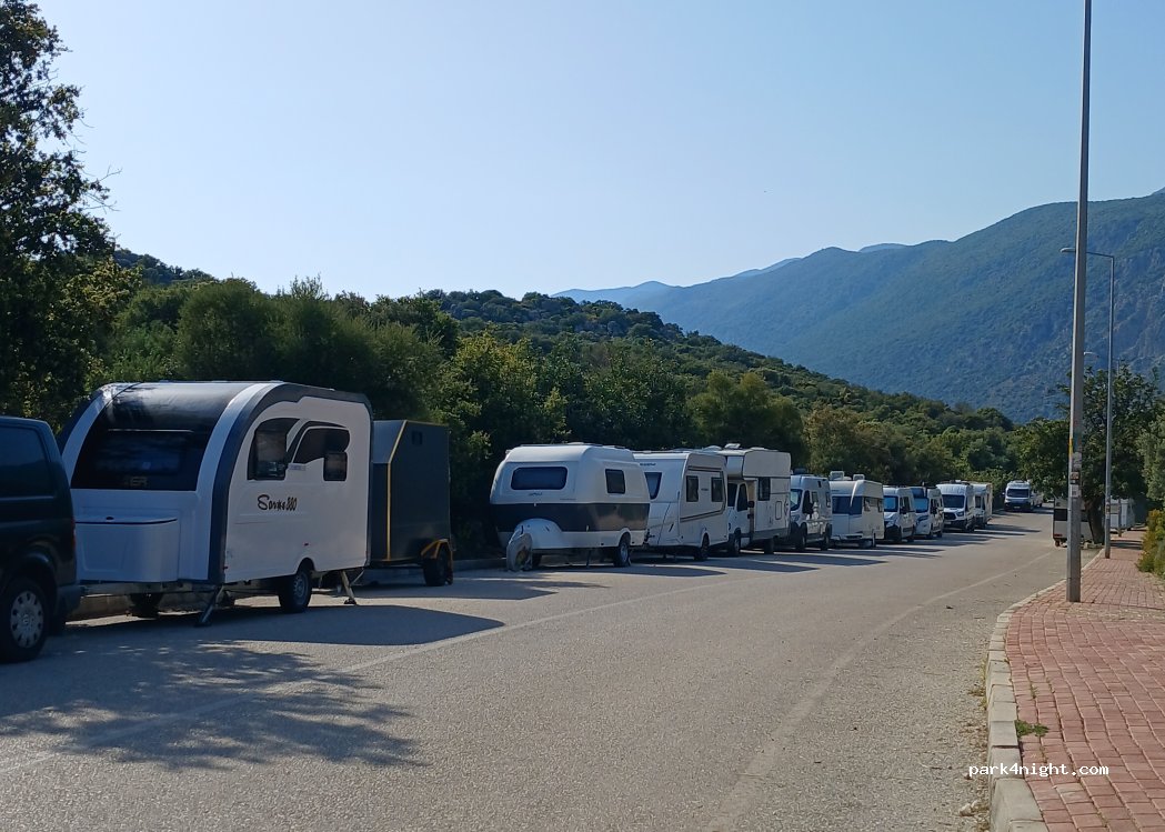 Parcheggio in una strada (vicolo cieco) che conduce al campeggio. A causa di una barriera stradale accessibile solo da ovest (così come il campeggio). Accanto si trova un vecchio anfiteatro e tombe di Licia da visitare (ingresso gratuito), dove è anche comune il campeggio. C'è una fonte d'acqua pubblica proprio accanto all'ingresso del campeggio. Il centro città è accessibile dopo una breve passeggiata.