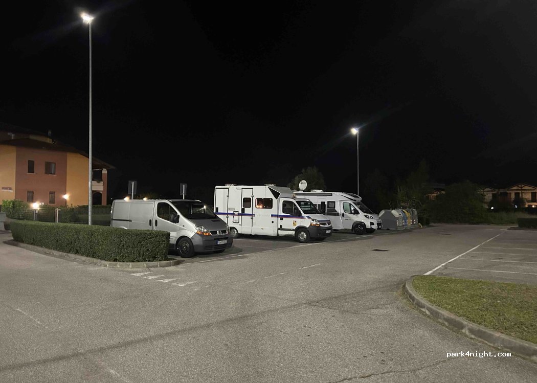 Nuit très calme,nous étions seul sur ce grand parking,la police à passé 2 fois sans souci,le soir jusqu'a 21h une équipe de foot est venu jouer sur le stade à coté avec ses aficionados qui chantais pour les encourager.La pointe de Sirmione à 5km avec vue sur lac de Garde est absolument à voir,attention beaucoup de monde donc en camping car très compliqué,même fin Mars, nous y avons été en Scooter