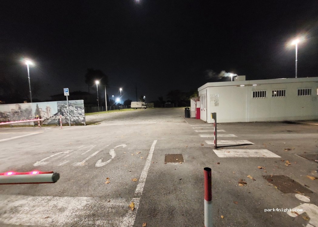 Ottima area sosta, zona tranquilla. Ingresso automatico tramite sbarra, 9 euro 12h (agosto) 3 euro elettricità 5 euro di tessera che viene restituita all'uscita con eventuale resto. Bagni e docce, carico, scarico ed elettricità. A 400 m 2 bar.