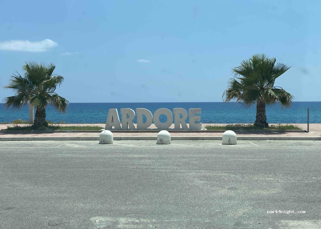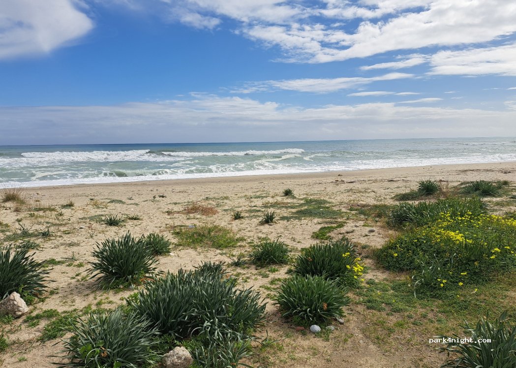 Parcheggio alla fine del lungomare asfaltato, fronte spiaggia o su uno spiazzo in terra poco oltre, qui c'è un punto di scarico, una doccia con rubinetto e i bidoni per immondizia. al momento nessuna area camper strutturata. tranquillo