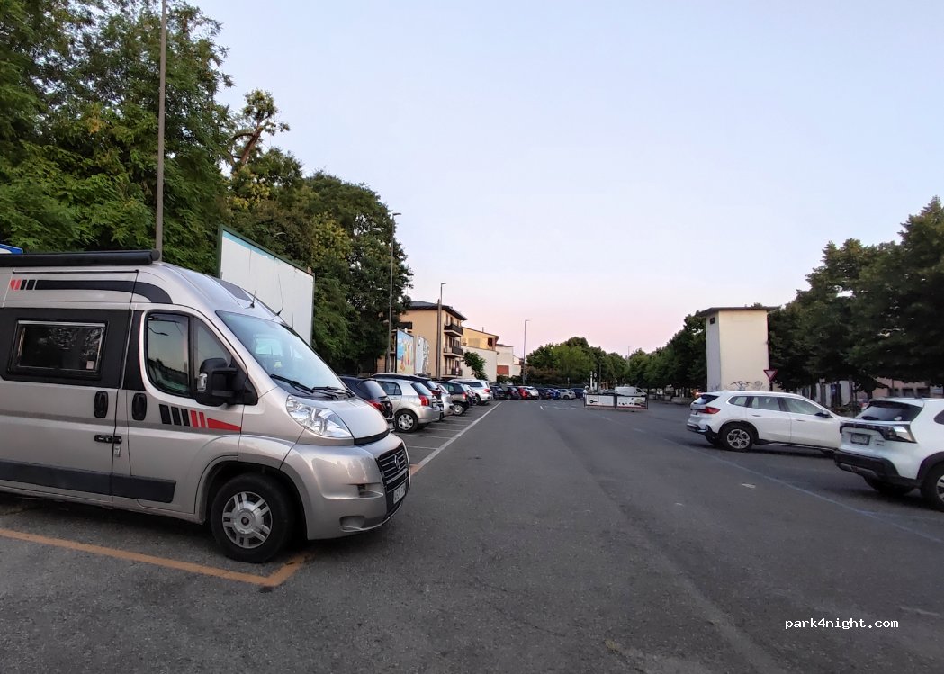 There are 2 dedicated parking places for motorhomes beside the service area. Smaller vans will fit in free parking spaces at the back of the carpark. These do not empty out until after 5pm. Busy road but we slept well. Services as per normal for Italy. Grey and black together. One tap. Good laundry service 4mins away. The carpark is on the SP412R. Satnav will bring you to closed entrance.