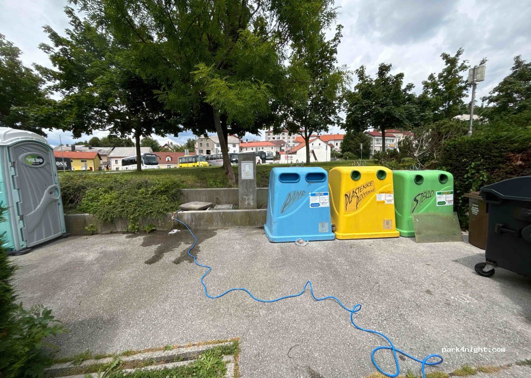 kostenlos, mit Müllentsorgung. Steckdosen auch vorhanden, haben wir allerdings nicht ausprobiert. Guter Ausgangspunkt zu den Höhlen von Postojna (15 min zu Fuß)