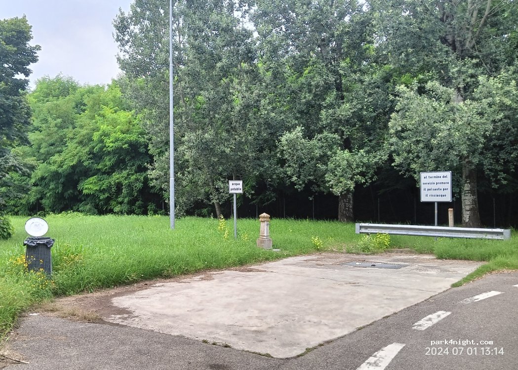 Area di sosta autostradale ma fuori dal casello. Disponibili tavoli da picnic, carico, scarico e bidoni della spazzatura.