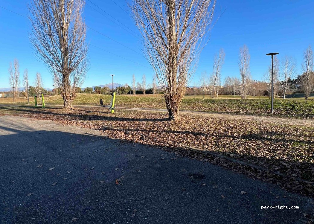 Parking tranquilo para pernoctar, cerca del parque. Aviso: a las 3 a.m. se enciende el riego automático del césped y te puedes llevar un buen susto al golpear el agua con el vehículo, como nos pasó a nosotros. Mejor no aparcar en las plazas junto al césped.