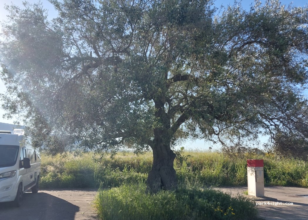 Zweckmäßig für eine Übernachtung, mehr aber auch nicht. Die Ver-/Entsorgungssäule haben wir nicht benötigt, sieht allerdings aus als ob dort länger kein Wasser gelaufen ist. Ansonsten hängen die Äste der Olive weit auf den Stellplatz, so das nur 2 WoMo's Platz finden.