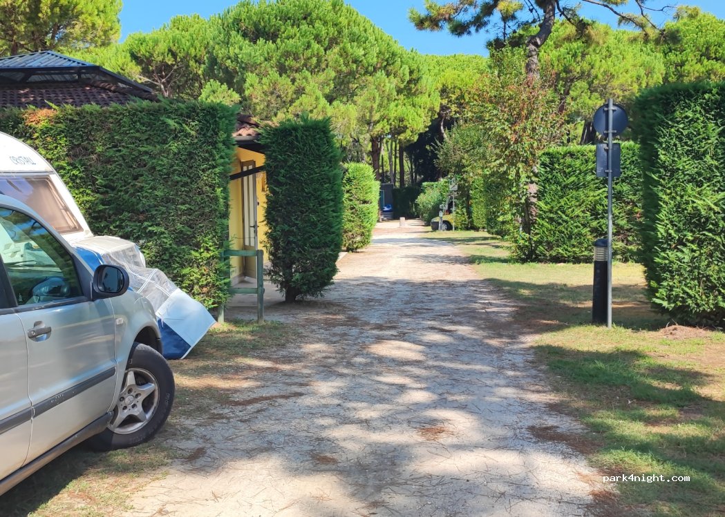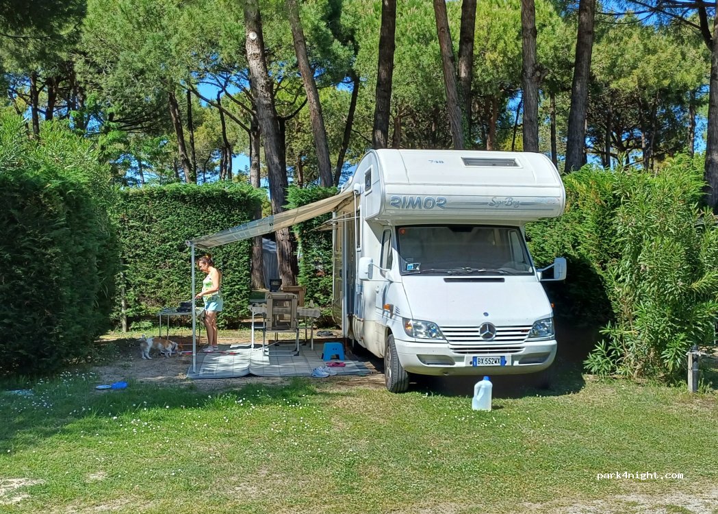 Camping Dune in Bibione Pineda in a pine forest. Beautiful and kind staff. 53€/day for 1 camper, 2 adults, 1 child and 1 dog. Electricity are included and wi-fi are 5€/all period. Clean and hot in august 2019.
