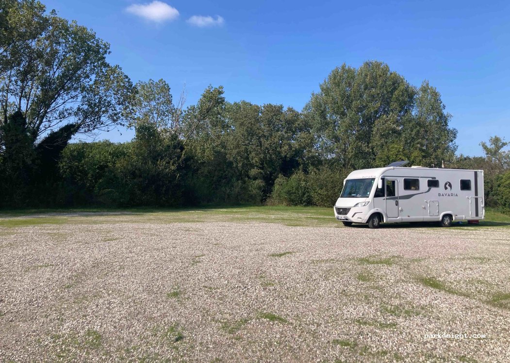 Parcheggio in piano su ghiaia . Carico acqua, 10 euro ogni 24 ore. Proprietario molto gentile. Comoda alla pista ciclopedonale che in pochi minuti porta a Mantova