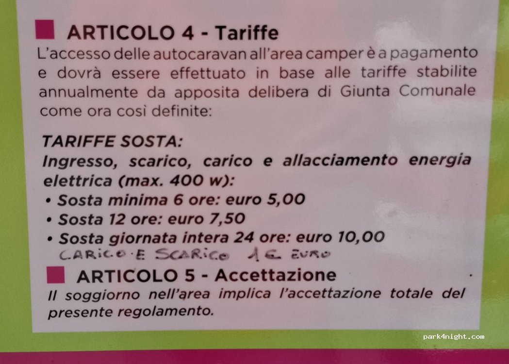 Ottima area di sosta stato il 6/12/21 €10 x 24 ore luce carico/scarico incluso grazie all'amministrazione comunale consiglio