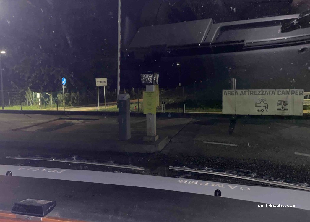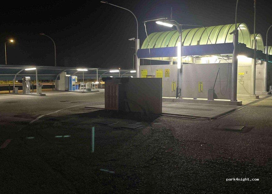 I 2 spazi per Camper si trovano alle spalle dell’autolavaggio all’interno dello stesso piazzale. Sono nell’angolo in fondo a sinistra. C’è la possibilità di fare carico e scarico acqua si paga 5€. La corrente costa 2€ x 2h. I gettoni sono alla macchinetta automatica dell’autolavaggio. Si trova su una superstrada. All’interno c’è un bar ma la sera è chiuso. Bagni aperti di notte accanto alle casse