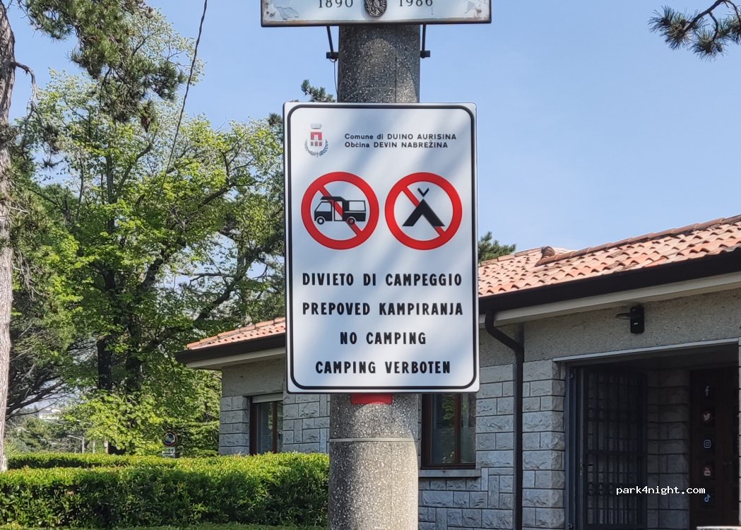 kleiner Parkplatz, schnell voll und nur bis Kastenwagen geeignet. Toilette und Picknick-Tisch vorhanden. Übernachten nicht gestattet, parken zum Wandern OK. Polizist kam vorbei als wir gerade geparkt hatten und hat das bestätigt. Idealer Ausgangspunkt für den Rilke-Weg, der hier beginnt. Sehr lohnenswert mit tollen Aussichten auf den Golf von Triest und das Schloss von Duino.