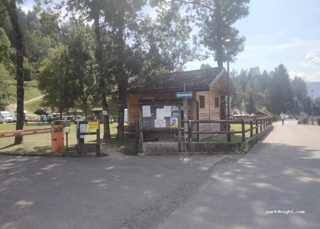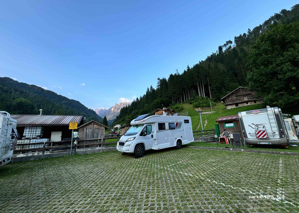 Area di sosta con un bel panorama sulla Val Canali. Disponibile corrente, scarico e carico. Docce a pagamento, abbastanza pulite. Piazzole molto piccole. Possibilità di escursioni in Val Canali e nel borgo vicino.