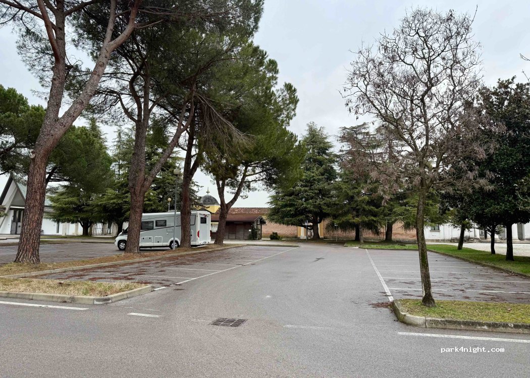 Ampio parcheggio gratuito di circa 70 posti adatto per giorno e notte per camper fino a 7.5 metri, coperto da alti alberi in zona verde molto tranquilla adiacente al cimitero. Centro di Portogruaro raggiungibile in 10 minuti a piedi.