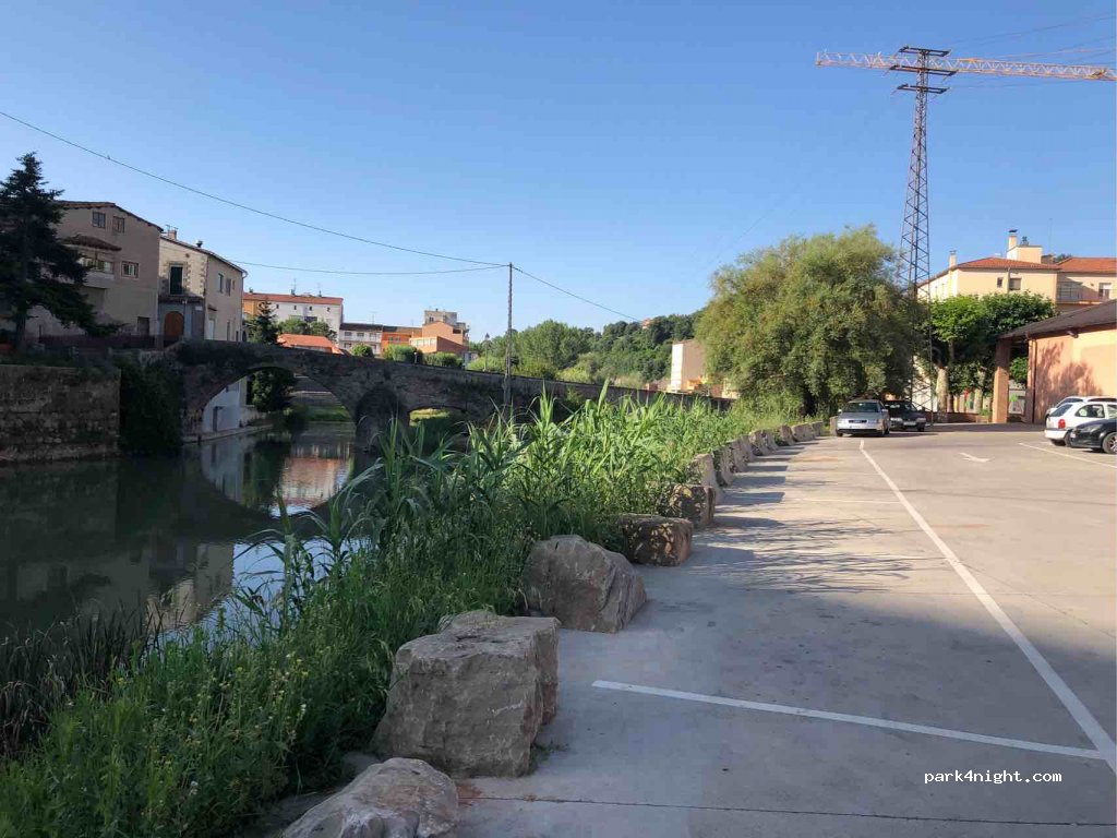 Parking next to the Llobregat river, overlooking the old town. Good lighting at night and very quiet. Attention access with a big slope, risky with an overhang. 1 minute walk towards the bridge and you'll have good drinking water.