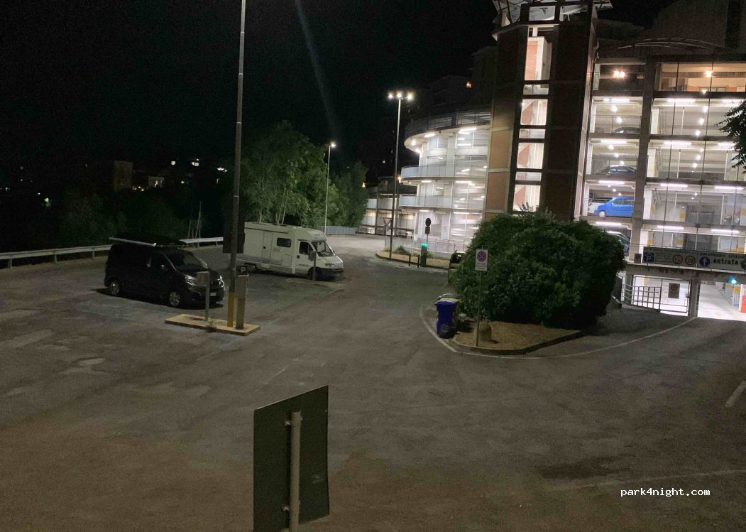Parking éclairé, calme, avec un ascenseur du parking à plusieurs niveaux qui mène à deux pas du centre historique de Macerata. Area camper près de la station de police. Calme.