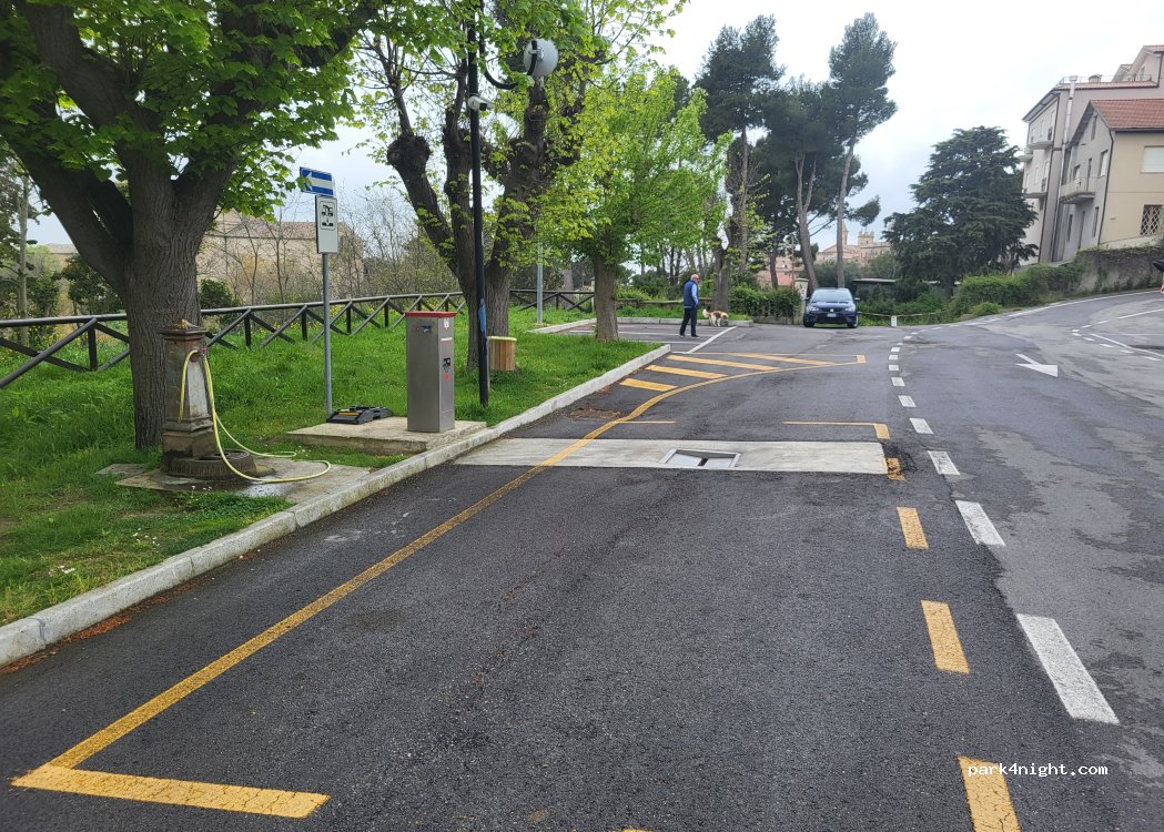 Area confinante con la stazione dei carabinieri e un parco pubblico, diversi posti occupati da camper di residenti e auto in sosta quindi non è facile trovare parcheggio. Borgo molto bello da visitare, notte super tranquilla. In fondo al parcheggio c'è un distributore pubblico dell'acqua quindi c'è un po' di traffico di auto che vengono a caricare