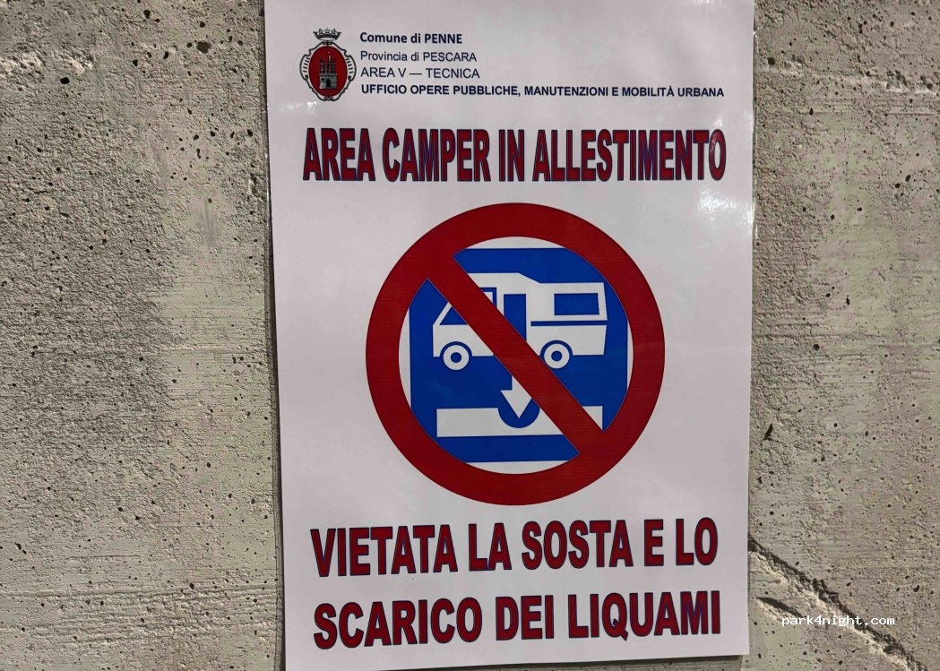 ottima area di sosta ancora in allestimento, comunque si può parcheggiare e visitare il paese di Penne, molto carino, salendo con l'ascensore. per i servizi occorre spostarsi nell'altra area vicino al centro camper service.