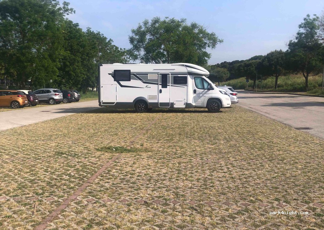 Ampio parcheggio libero con 260 posti, tranne al sabato giorno di mercato. Alcuni posteggi in piano altri in pendenza. Tramite sottopassaggio si raggiunge la spiaggia in un attimo sia a piedi che in bici. situato a fianco della statale adriatica un po’ rumoroso al mattino presto. La prima notte trascorsa bene, la seconda ci siamo spostati a causa della chiusura del tratto autostradale e tutto il traffico leggero e pesante passava da lì. Ci sono anche due wc chimici sempre puliti