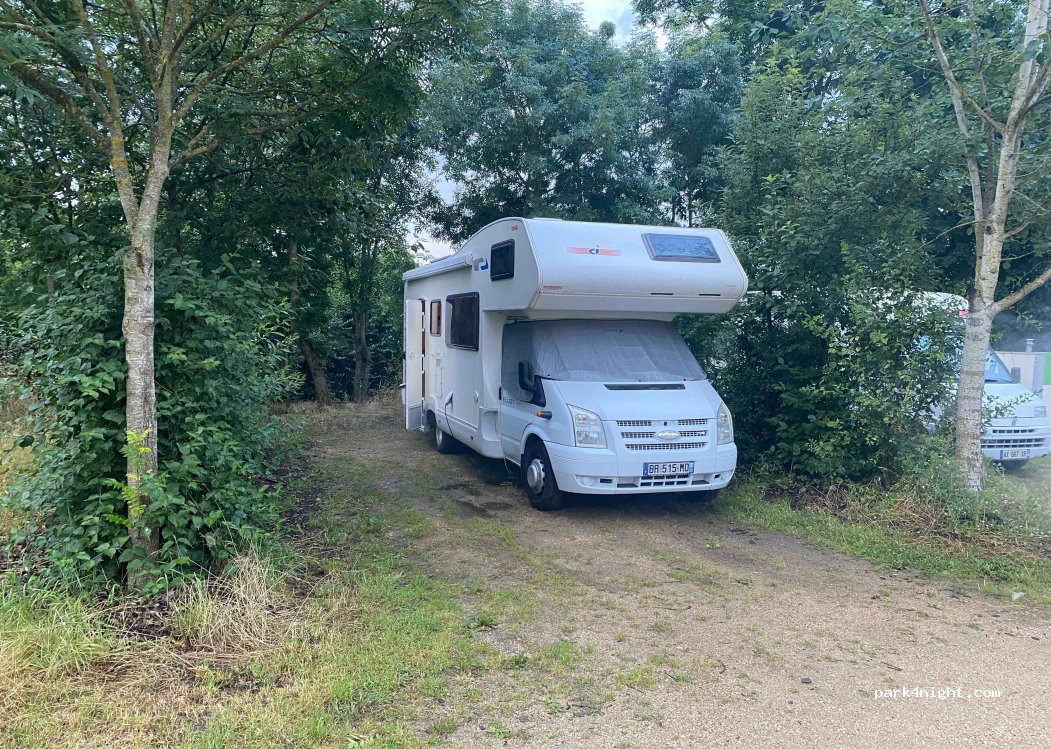 Belle aire pour camping car avec quelques arbres et près d’un petit étang. Nuit calme