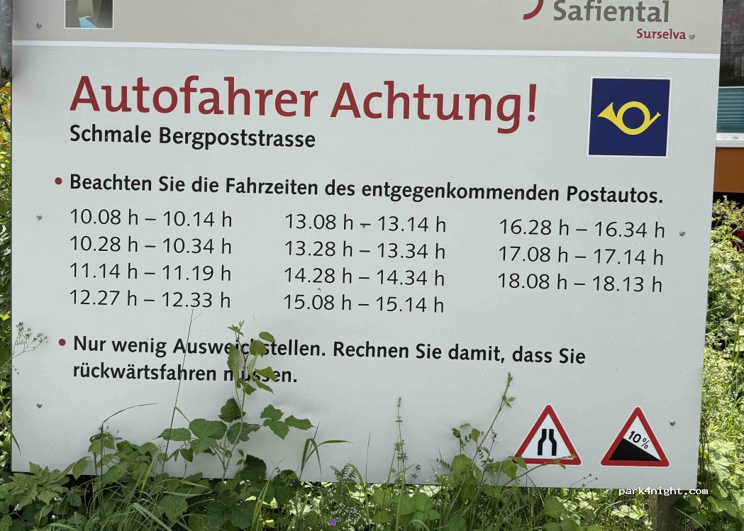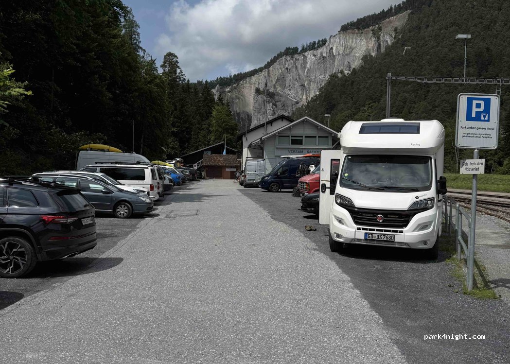 Schotterparkplätze am Bahnhof Versam Safien; 5 CHF für 24 Std.; ruhig bis auf die Züge; sauberes WC im Bahnhofsgebäude immer geöffnet; wenige Schritte bis zum Vorderrhein; Straße dorthin sieht abenteuerlich aus, wird aber von Linienbussen befahren - mit 6,40m-Van keine Probleme
