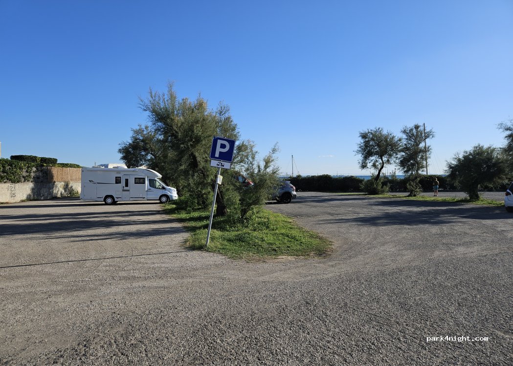 Parcheggio camper riservato, indicato con cartello specifico, nella prima corsia dell’entrata. Ho visto multare le automobili perché sostavano in zona camper!!!! Vicino al mare, tranquillo, nessun limite orario. Non c’è spiaggia, ma scogli. Balneabile