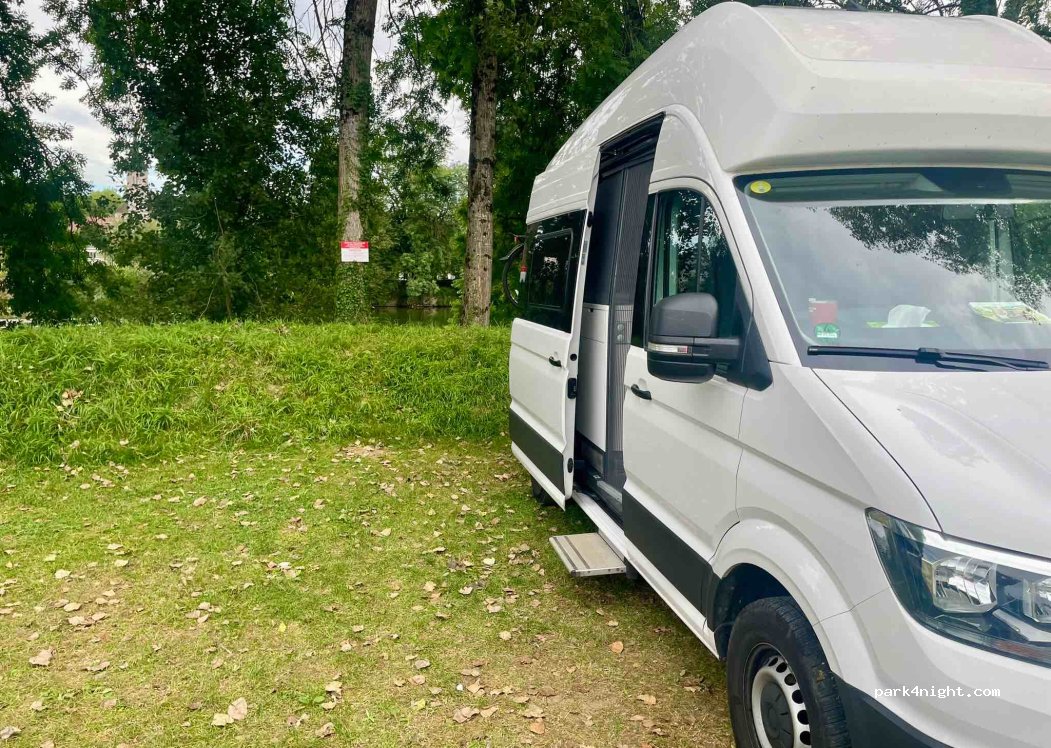 Campingplatz ist geöffnet. Direkte Lage am Fluss. Uns gefällt es hier. Preis für 1 Nacht für 2 Personen, 1 Hund, Strom, Wohnmobil: 21 EUR