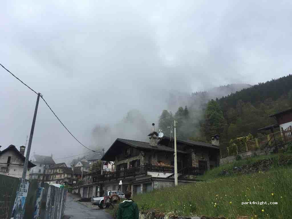 Small parking area outside the local shop and rubbish bins. We slept in our van for three nights here and left it during the day, and had no problems. There is another parking area with public toilets available down the road a little way. The drive up to Trasquera was full of hairpins, but lots of nice walks and wonderful mountain views available once you’re there.
