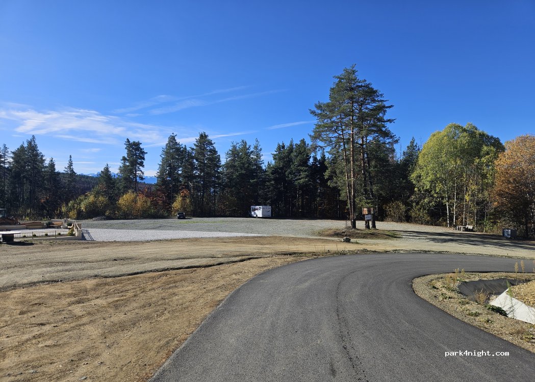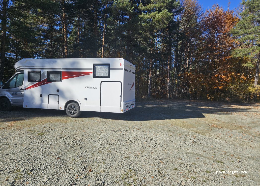 Grand parking, en légère pente sur un sol en gravier, calme la nuit, utile pour le fun Park. On peut monter facilement au parc des ours, à pied ou en camping car, la piste depuis ce parking étant meilleure que celle pour arriver ici. Celle-ci est défoncée sur 550m, mais néanmoins praticable par temps sec. Aucun service sur le spot.