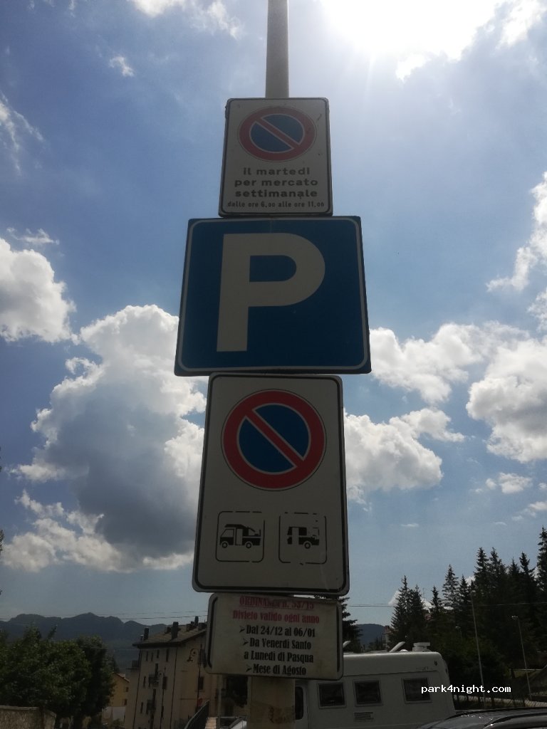 Ampio parcheggio asfaltato in pendenza piccola attenzione al divieto riservato ai camper per i periodi riportati come da foto. Nessun servizio. Nessuna ombra. A due passi dal centro del paese.