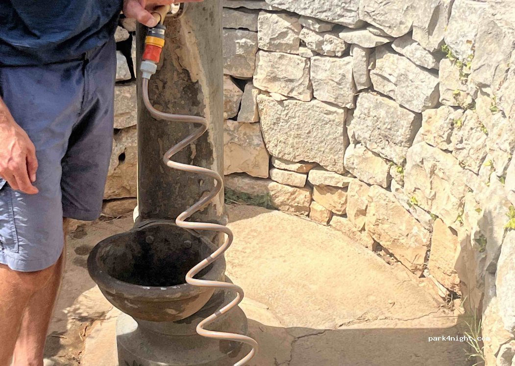 Public drinking water fountain near the little church in Contrada Genna. On the right you go down to the organic farm Masseria didactic Atipica, which is part of the home-camper, parking and hospitality circuit