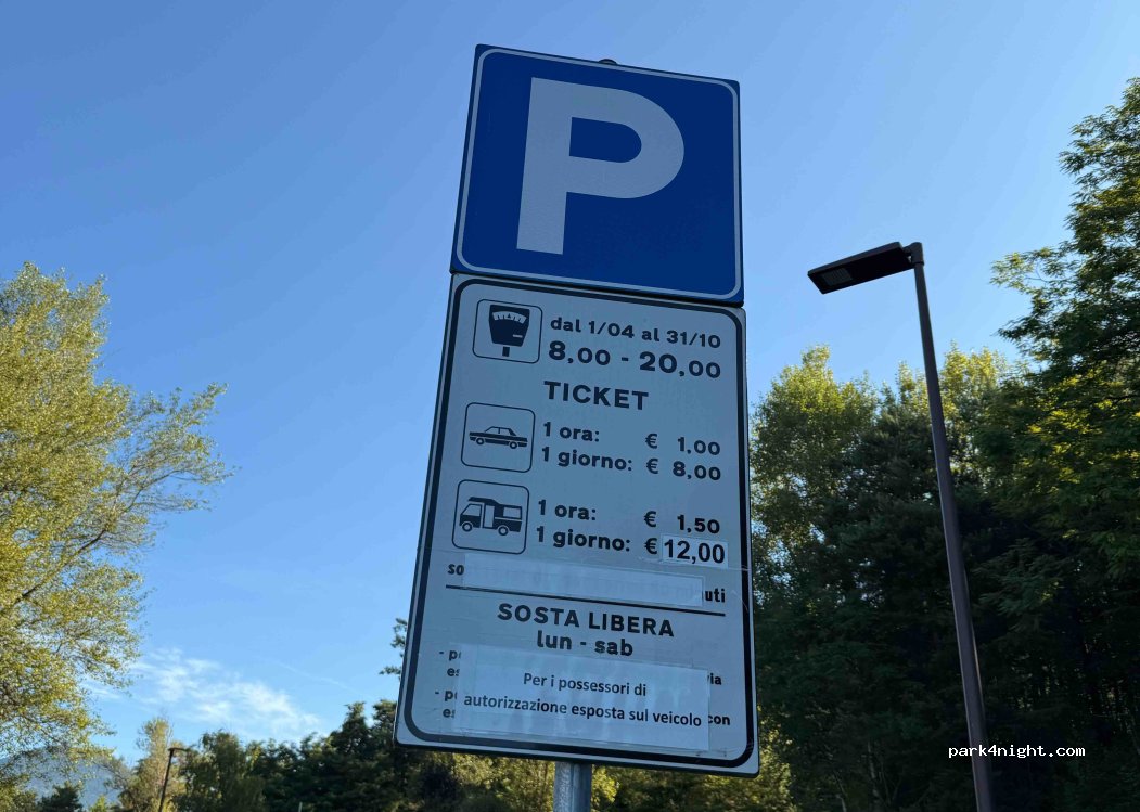 Parcheggio tranquillo a due passi dal lago. Si paga tutto o giorni dalle 8 alle 20. 1 euro all’ora per le auto (8€ al giorno). 1,5 all’ora per i camper (12€ al giorno)