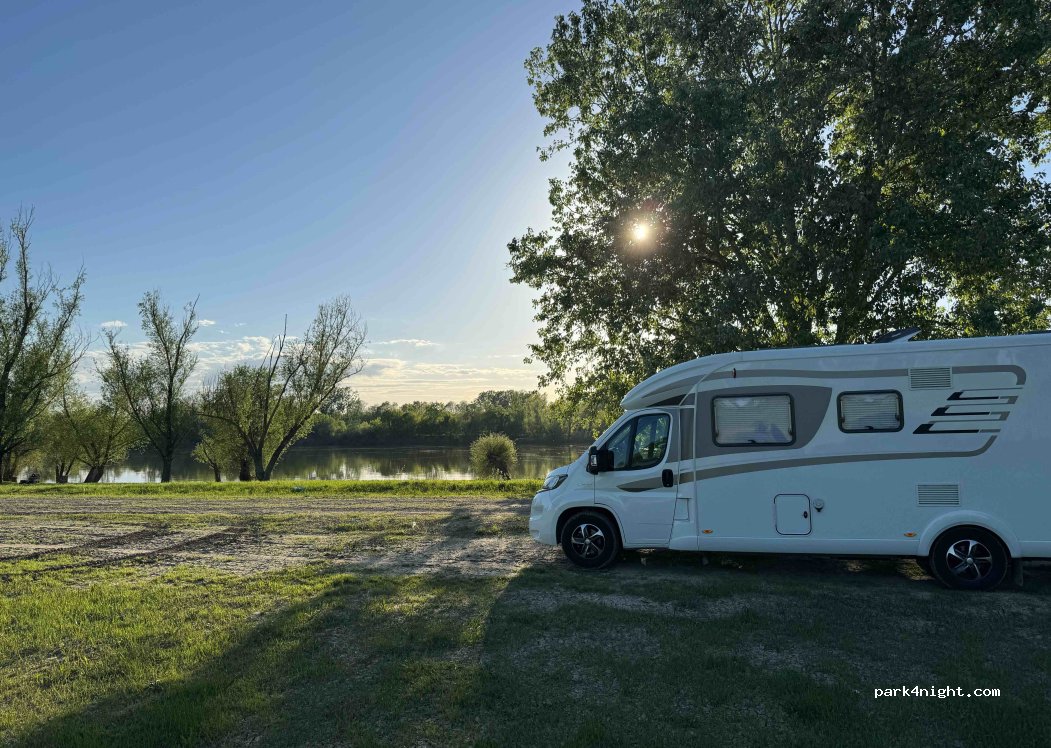 Endroit très vaste avec nombreuses places à l'ombre sous les arbres ou au soleil, pelouse partout, nombreuses poubelles à disposition, wc et douches (type douche de plage en plein air), terrain relativement plat, nuit très calme pas un bruit, la police est passée plusieurs fois, supermarchés dont Lidl pas très loin, et stations carburant.