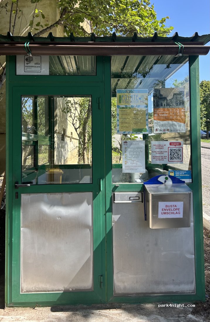 Guter und günstiger Stellplatz für die Besichtigung von Asolo , unkomplizierter Eigentümer, der einem gegen Unterschrift den Schranken und Müllschlüssel aushändigt , den man dann bei Abreise in den Briefkasten wirft .10 Euro inkl. Strom