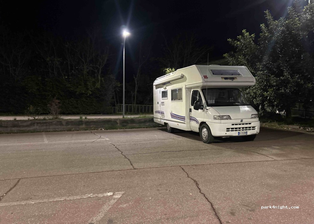 Parking en pente douce. Mettez-vous en bas à gauche et superbe vue et tranquillité assurée. Par politesse, allez en face chez les carabinieri pour signaler votre présence, ils y seront sensibles et on sera bien gardé.
